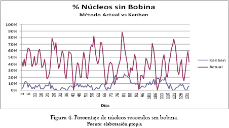 Con la metodología Kanban propuesta, el porcentaje de bobinas sin núcleo es muy bajo. Esto se debe a las reglas que establece la metodología Kanban en su implementación, en la cual el lote de producción que se programa en el día X para la sección de bobinado es el lote que se cargó en el horno de recocido en el día X–1. Esta regla garantiza que las bobinas a procesar sí tengan núcleo recocido al finalizar su proceso. Con la regla anterior se produce un resultado que es correspondiente a un justo a tiempo en la línea de armado y conexión, con lo cual se genera una disminución en los niveles de inventario de producto en proceso.