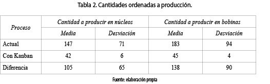 La tabla 2 presenta el promedio de las cantidades enviadas a producción de bobinas y núcleos para el proceso actual y mejorado con la metodología Kanban, donde se observa la reducción importante en las cantidades de fabricación para las bobinas y los núcleos. Además de la figura 6 y de la tabla 2 se observa cómo se disminuye la variabilidad en estas cantidades a producir, lo que permite realizar mejores procesos de planificación de la producción para operaciones futuras, así como disminuir el inventario de producto en proceso a largo del período de fabricación.