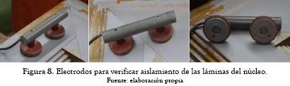 Durante el ensamble del núcleo, se verifica el recubrimiento aislante de las láminas, empleando el procedimiento sugerido por el estándar internacional [10]; dado que no existe un criterio normalizado del valor del aislamiento, se emplea el dado en [2], el cual sugiere que al menos el 80 % de las lecturas realizadas sobre una muestra de núcleo debe ser mayor de 2Ω y el 50 % mayor de 5Ω. Para ello se diseñó y construyó un dispositivo el cual consta de dos electrodos planos con una diferencia de potencial de 1,5 VDC entre ellos; dichos electrodos se ubican a lo largo de las láminas y entre láminas adyacentes. Cuando el recubrimiento aislante está defectuoso, se enciende un piloto de señalización (ver figuras 7 y 8).