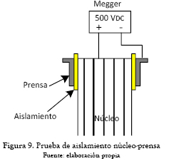 Una vez finalizado el ensamble del núcleo, se verifica el aislamiento núcleo contra tierra, energizando el núcleo y aterrizando la prensa (ver figura 9). El voltaje de prueba máximo es de 1000 V.