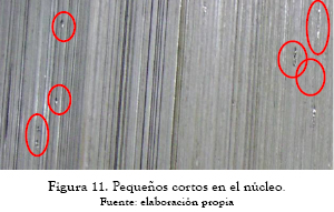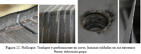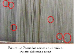 Desde 1999 hasta 2009 el transformador presentaba aumento en los gases etano, metano, monóxido y etileno, siendo este último el más crítico. En enero de 2010 el transformador presentó falla en la bobina de 46 kV. El transformador fue llevado al taller de reparación y una vez retiradas las bobinas y fibras de aislamiento de las columnas, adicional a la falla en el devanado, se evidenciaron pequeños cortos entre láminas en todas las columnas, como presentan las figuras 10 y 11.