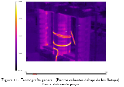 Se hizo la prueba de magnetización e inspección termográfica y se encontraron numerosos puntos calientes entre los fletajes lo que indica la existencia de otros puntos calientes no detectados en la inspección visual (ver figuras 12 y 13).