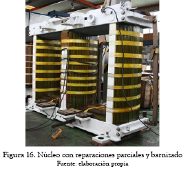 Los cortos y puntos calientes encontrados fueron reparados parcialmente abriendo cuidadosamente las láminas e instalando fibras Nómex de 0,1 mm entre ellas. Los fletajes fueron cambiados y se barnizó todo el núcleo, como se ve en las figuras 14, 15 y 16.