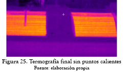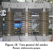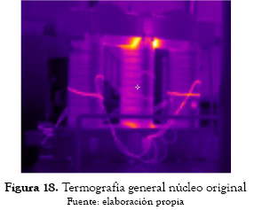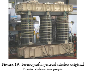 El tipo de lámina utilizada en el nuevo diseño fue M4 de 0,27 mm; el peso original del núcleo era 34542 kg y con láminas nuevas fue de 35947 kg; la sección transversal de las columnas se conservó con respecto al diseño original. No se evidenciaron puntos calientes en la prueba de inspección termográfica con el núcleo nuevo, como se presenta en las figuras 25 a 28.