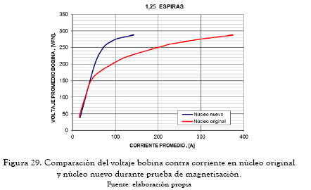 Se observó una disminución de las pérdidas en vacío cercanas al 20 % y disminución de la corriente de vacío al 50 % como indica la figura 29.