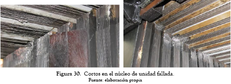 Un banco trifásico de unidades del año 1978 presentó falla en una unidad. La empresa de energía decidió reparar la unida fallada y reconstruir las otras dos unidades. La falla en las bobinas de la unidad del transformador fue considerable y alcanzó a realizar cortos gran parte del núcleo, como se muestra en la figura 30.