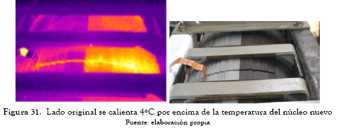 Se realizó la prueba de magnetización y medición de pérdidas en los tres núcleos y el núcleo con cortos evidenció puntos calientes en los grupos de láminas de medio núcleo; adicionalmente este presentó un aumento del 10 % en las pérdidas de vacío (tabla 3); a esta unidad se le cambió medio núcleo. Las pruebas finales del núcleo ya reparado evidenciaron una disminución del 5 % de las pérdidas de vacío respecto a las otras dos unidades (tabla 3), y disminución en la temperatura del núcleo nuevo respecto al original, como se observa en las figuras 31 y 32.