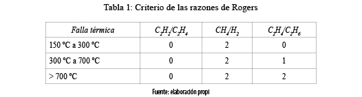 De acuerdo con el criterio del gas clave y Rogers [6], las relaciones acetileno/ etileno, metano/hidrógeno y etileno/etano indican sobrecalentamiento localizado en el núcleo debido a concentraciones de flujo, incremento de temperatura de puntos calientes y/o sobrecalentamiento en el cobre debido a falsos contactos (formación de carbón) como presenta la tabla 1.
