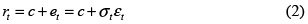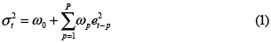 where E(rt) = c, with c ≠ 0. εt is a random variable following a normal standard distribution. Several conditions are imposed to the parameters ωp (p = 0, ..., P) to ensure that the unconditional variance of et is finite and positive.