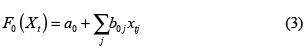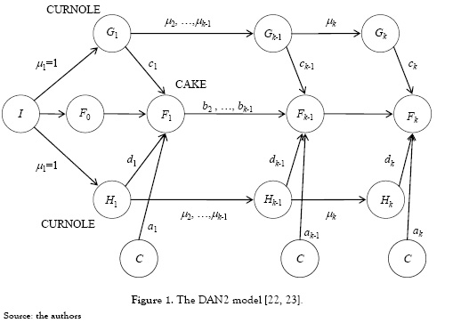 The DAN2 architecture developed in [22, 23] is described in this section. Figure 1 shows the architecture of the DAN2 neural network. In DAN2, inputs are presented to the net through the input node I all at once, and not as a sequential process such that it is the common practice in neural network literature. There is one linear layer with a unique neuron, F0, which represents a current accumulated knowledge element or CAKE node. Define yt as the time series {y1, ..., yT]. The variable X = {Xt; t = P + 1, ..., T] is an input matrix where each row, Xt = {xtj = 1, ..., m], corresponds to the lagged values of the a variable explaining yt. P is the maximum lag considered when we built X. The node F0(X) is defined as an autoregressive model, such that: