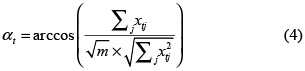 The next hidden layers are composed by four neurons: the first neuron has not input connections and its output is unitary; this neuron is noted by the letter C in Figure 1. In each hidden nonlinear layer, DAN2 uses a nonlinear transformation based on the projection of Xt over a predefined and fixed reference vector R = {rj; j = 1, ..., m] to normalize the data. Here, m is the number of columns of the row vector Xt. For this, the angle, t, between each data vector Xt and the vector R is calculated. Without loss of generality, R can be defined as a vector of ones. Thus, the angle αt is calculat-ed as: