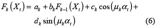 which can be understood as a generalized Fourier series for function approximation. The constant k is equivalent to a rotation and a translation of the reference vector R and it allows us to extract the nonlinear component in the data. The variation in the value of k changes the projection of Xt over R and, as a consequence, its contribution to the final solution. Eq. (5) is represented in each hidden layer by two CURNOLE (current residual nonlinear element) nodes. The first CURNOLE node calculates the cosine function (Gk nodes in Fig. 1) and the second node calculates the sine function (the Hk nodes in Fig. 1).