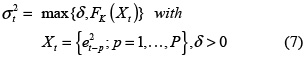In his seminal work, Engle [7] introduces the autoregressive conditional heteroskedasticity (ARCH) model of order P for forecasting the conditional variance, σ2t, of the return, rt, as a function of previous squared shocks, e2t–p: