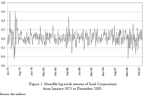 In this experiment, we use the monthly log stock returns of Intel Corporation from January 1973 to December 2003 (372 observations), plotted in Figure 2; Tsay [26] demonstrates the existence of conditional heteroscedasticity in the return series, and he suggests that an ARCH (3) model might be appropriate for representing the conditional variance, when all available data are used for model estimation and validation.