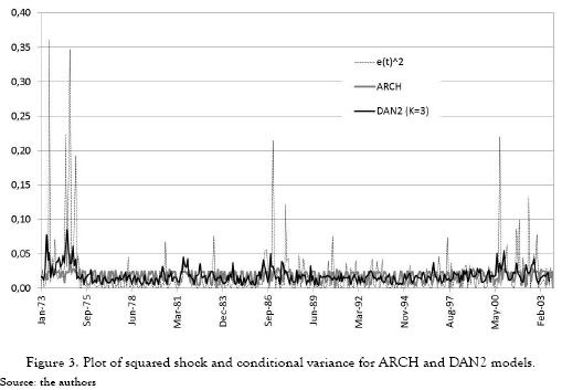 Finally, we plot the squared shocks and the conditional variance forecasts obtained with ARCH and DAN2 (K = 3) models (Figure 3) for the entire dataset. DAN2 seems to follow better the changes in the values of shocks than the ARCH model; in addition, forecasted values seem to be very different for both models.