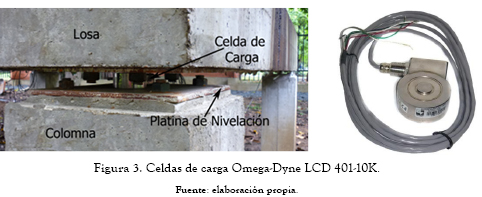 Para cuantificar las cargas dinámicas generadas por actividades rítmicas se ejecutaron ensayos de laboratorio en una plataforma experimental de hormigón armado. Esta consiste en una losa aligerada a escala real de 4 m de ancho y 4 m de largo, con una loseta de 8 cm de espesor, soportada por vigas perimetrales de 25 cm de base por 32cm de altura y viguetas de 10 cm x 32cm. El entrepiso está apoyado sobre cuatro celdas de carga situadas en las esquinas de la losa, las cuales se ubicaron en medio de platinas de nivelación, como lo muestra la figura 2. El sistema (losa de hormigón y celdas de carga) posee una frecuencia natural superior a las frecuencias esperadas producidas por las actividades humanas, para minimizar la interacción entre la carga y la plataforma de medición.