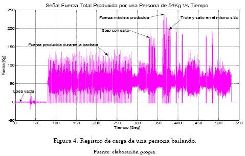 Para analizar la influencia de las cargas producidas por actividades rítmicas se ejecutó una secuencia de baile sincronizado al ritmo de los géneros salsa, merengue, bachata y reggaetón. Cada rutina se ejecutó repetidas veces, incrementado de uno en uno el número de personas hasta llegar a un total de nueve individuos. Cada registro inició 80 segundos antes con la losa vacía con el fin de verificar el peso de la persona y la calibración de los equipos de adquisición. También se llevó a cabo un control visual del comportamiento de las personas durante las actividades para identificar en el análisis rangos de mayor sincronización, movimientos de alto impacto y el estado de ánimo de los participantes. Las señales fueron separadas según el género musical en diferentes intervalos para determinar las características de cada uno de los movimientos ejecutados, como se observa en la figura 4. Dichas señales se analizaron mediante un algoritmo desarrollado en el paquete matemático MATLAB, que permite obtener la transformada rápida de Fourier (FFT).