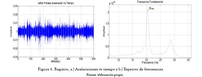 La frecuencia fundamental de la plataforma se determinó a partir de registros ambientales obtenidos a una frecuencia de muestreo de 256 Hz. Cada viga y vigueta se instrumentaron con cuatro acelerómetros (figura 5). Igualmente se efectuaron ensayos de vibración forzada, utilizando un agitador de masa (shaker) con una excitación variable entre 1 Hz a 30 Hz. Dada la configuración estructural de la plataforma y la distribución de las viguetas, se encontró que la frecuencia fundamental de la losa es de 20.5 Hz correspondiente a un modo de vibración vertical. Esta frecuencia y su respectivo registro de aceleración se muestran en la figura 6.