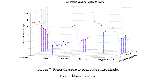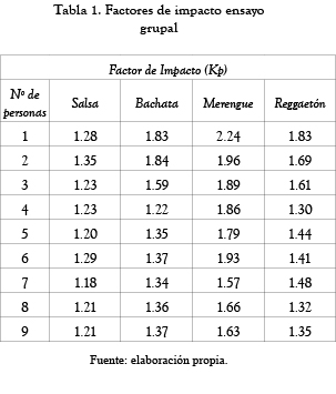 Para la obtención de los factores de impacto, la fuerza producida por las personas al bailar de manera sincronizada es normalizada por su peso estático. La tabla 1 presenta los factores de impacto obtenidos experimentalmente para cada uno de las actividades rítmicas coordinadas.