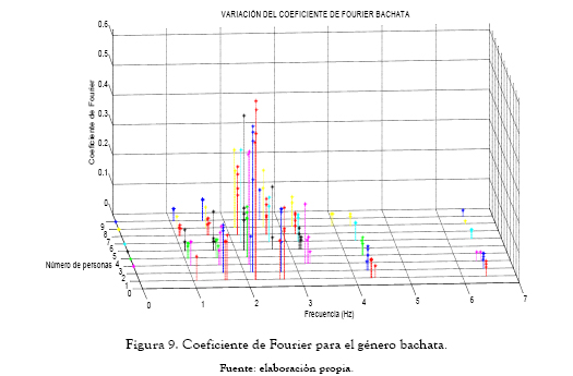 Con el fin de obtener la distribución de la carga dinámica generada por las actividades rítmicas, se obtuvieron los coeficientes de Fourier para cada una de las rutinas ejecutadas en forma sincronizada para los géneros de salsa, bachata, merengue y reggaetón. En la tabla 2 se presentan los valores de los coeficientes de Fourier y las frecuencias asociadas para el ritmo de salsa.