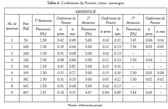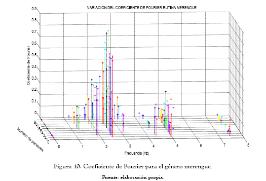 Asímismo, se puede observar la presencia de una frecuencia marcada en 1.094 Hz, donde se genera un aporte de fuerza menor, debido a que en la ejecución en dicho tiempo se da un leve toque del pie sin llegar a pasar el peso. La variación del coeficiente de Fourier para el género de merengue y sus frecuencias asociadas se muestran en la tabla 4.