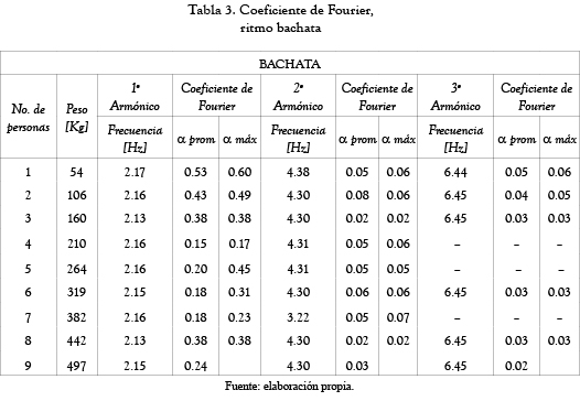 En la tabla 3, se presentan los resultados para el género bachata en la modalidad de baile sincronizado donde se puede apreciar la variación del coeficiente de Fourier y sus frecuencias asociadas, los cuales demuestran que en una frecuencia alrededor de 2.16 Hz se presenta el mayor aporte de carga.