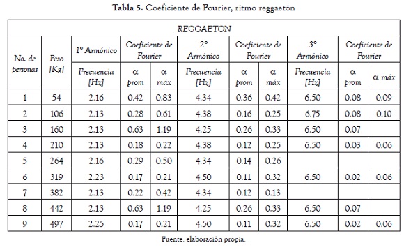 Finalmente, para el género de reggaetón los resultados obtenidos se resumen en la tabla 5, donde se muestran la variación del coeficiente de Fourier y sus frecuencias asociadas. Los componentes dinámicos principales de la carga rítmica para dicho género son significativos hasta el tercer armónico. A diferencia de los géneros musicales anteriores, este se caracteriza por sostener una frecuencia principal similar a la de salto de una persona, ya que los dos pies tienden a estar en contacto con la plataforma al mismo tiempo.