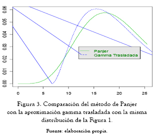 Para el caso del gráfico anterior (figura 1), donde se asume que las pérdidas siguen una distribución Pareto(4,3) y la frecuencia Poisson(20), los valores faltantes son μ = 1 y μ2 = 3. Con estos valores se grafica la densidad con la aproximación normal y se compara con la densidad obtenida mediante la recursión de Panjer.