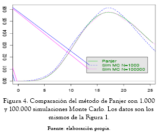 El método más sencillo de obtener pérdidas agregadas es la simulación Monte Carlo y a continuación se presenta una comparación de las densidades con el método recursivo de Panjer.