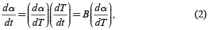 La variación dα/dt se toma como el producto de dos funciones, una de T y otra de α
