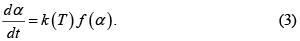 donde E es la energía de activación (o de ''activación aparente''), A es el factor preexponencial, y R=8.31451J/mol·K. La función f(α) depende del orden de reacción n. Por ejemplo, para un modelo de ley de potencia [7]