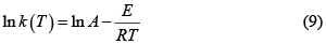 los parámetros A y E se obtienen del intercepto y la pendiente de la gráfica lnk(T) frente a 1/T. El método integral se basa en la Ec. 3, por ejemplo con f(α)=(1–α)n