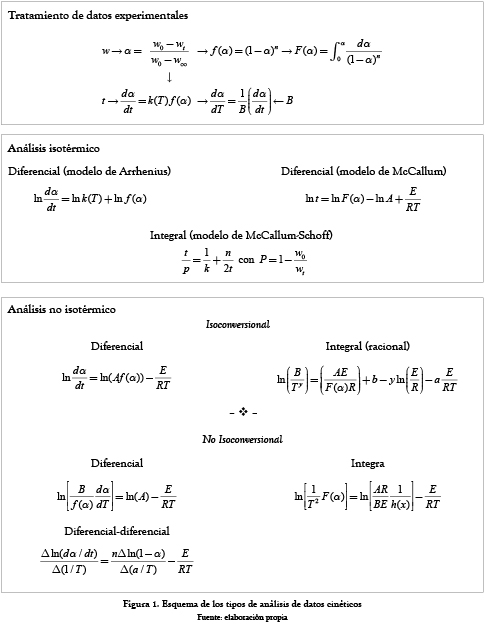 La elección de un tipo de análisis para determinar la cinética de degradación depende del tipo de material. Existen al menos 52 métodos analíticos distintos [8-12], que se han aplicado en degradación térmica [10], pirólisis [13], y combustión [5]. Por tipo de material hay métodos publicados para termoplásticos [10-11, 14-15], elastómeros [16], materiales compuestos y nonocompuestos [12], mezclas de polímeros [17], biopolímeros [18], carbón [5], residuos de petróleo [19], cauchos [20], pino [21], celulosa [6], quitina y quitosano [22], resinas epóxicas [23], fibras naturales-biomasa [24], aceites vegetales [7], y biodiesel [9].