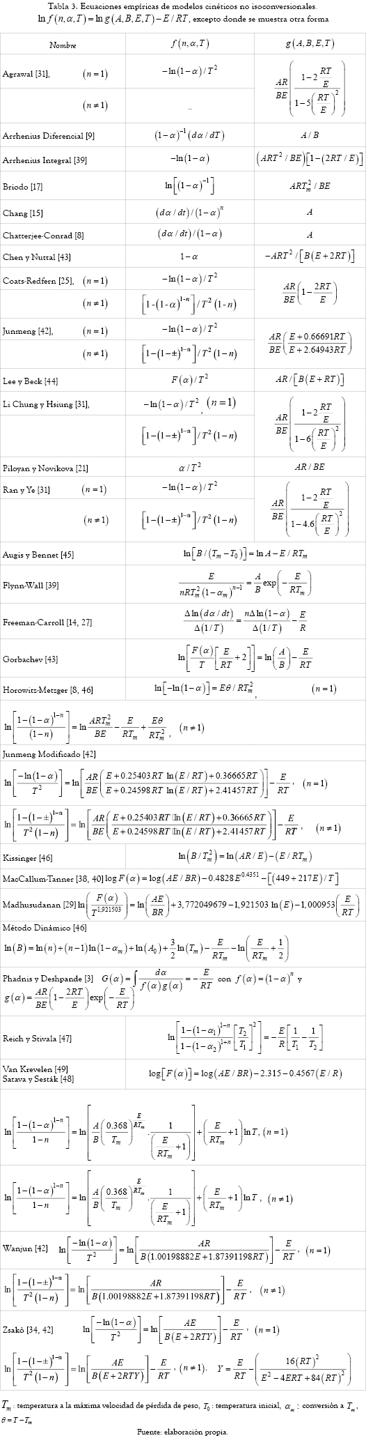 Además del esquema de clasificación se presenta un resumen de modelos reportados en la literatura para el estudio cinético de la degradación térmica de polímeros (tablas 3 y 4). Son variaciones de las ecuaciones 8 y 11, en las que se pueden aplicar aproximaciones exponenciales o racionales para p(x). Los modelos están clasificados en no isoconversionales (tabla 3) e isoconversionales (tabla 4). En la tabla 3 los modelos Diferencial de Arrhenius, Kissinger, Flynn-Wall, Chang y Dinámico son modelos diferenciales; el modelo Freeman-Carroll es diferencial-diferencia; los demás modelos son integrales. En la tabla 4 los modelos de Friedman, Sharp y Friedman-Reich-Levi son diferenciales, mientras que los demás son modelos integrales.