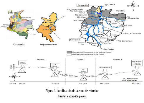 La figura 1 muestra el tramo de 135,7 km del río Cauca evaluado (jurisdicción de dos departamentos: Cauca y Valle del Cauca). La selección de los puntos de muestreo se fundamentó en el progresivo deterioro de la calidad del agua del río Cauca a partir del embalse Salvajina.