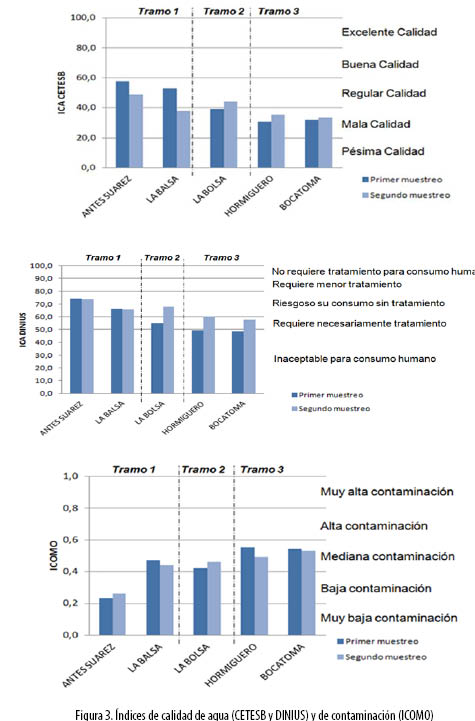 La figura 3 muestra los índices de calidad y de contaminación calculados con base en los resultados de calidad de agua.