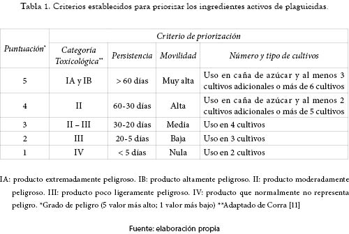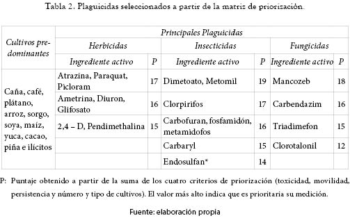 Con relación a la agricultura, el uso de plaguicidas fue prioritario, y se destacaron 130 ingredientes activos (60 herbicidas, 38 insecticidas y 32 fungicidas) usados en los principales cultivos de la zona [10] de los cuales se priorizaron 6 herbicidas, 6 insecticidas y 2 fungicidas usando criterios como número de cultivos en que se emplea y características químicas (toxicidad, movilidad y persistencia del ingrediente activo). La tabla 1 resume la puntuación y clasificación de los criterios empleados en la matriz de priorización de los plaguicidas usados, y la tabla 2, el listado de plaguicidas seleccionados a partir de esta matriz.