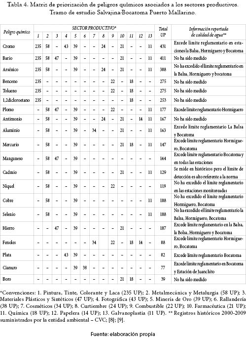 La tabla 4 muestra la matriz de priorización basada en el número de UP que utiliza el peligro químico por cada una de las 13 categorías asociadas a los procesos productivos, contrastándose con información bibliográfica que ha reportado resultados de calidad de agua en la zona de estudio.