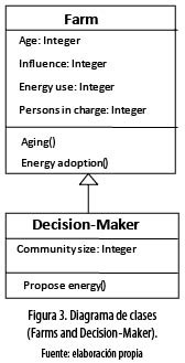 Revisión del proceso e itinerario. Los dos tipos de agentes que existen en el modelo son las granjas y los decisores, y están uniformemente distribuidos en la región. Para esta distribución, la única restricción es que dos agentes no pueden ubicarse en la misma posición simultáneamente. Cada cabeza de hogar posee una granja, y el decisor es también un granjero que pertenece a la comunidad, el cual, además, representa a toda la comunidad. En todo el modelo solo están presentes las granjas y los decisores, los cuales poseen las propiedades que se presentan en la figura 3. Una descripción detallada de las variables y las funciones es presentada posteriormente en la sección de submodelos. Al inicio de la simulación, todos los parámetros son inicializados de acuerdo con una distribución uniforme, que relaciona al tamaño de las granjas, medido en el número de parches que ocupa cada granja. Las conexiones entre granjas son creadas empleando una simple propiedad de vecindad inmediata, es decir, granjeros con granjas adyacentes son unidos. Para las granjas las variables usadas son: