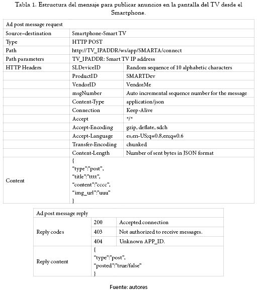 En consecuencia, se ha proporcionado una implementación de referencia para la arquitectura propuesta usando el framework Apache Mahout [18] para el SR, el SDK de Samsung para el Smart TV [19] y la plataforma Android para la aplicación móvil. Igualmente, se ha desarrollado un API estilo REST para habilitar la comunicación entre el SR, el Smart TV y los Smartphones, al tiempo que un protocolo basado en UPnP fue implementado para soportar la colaboración Smart TV–Smartphone. Como una breve descripción del protocolo, la figura 2 muestra un diagrama de flujo simple relacionado con el proceso de descubrimiento entre los teléfonos y el Smart TV, y la tabla 1 muestra la estructura de un mensaje para publicar anuncios en la pantalla del TV desde el móvil.