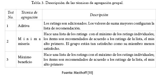 Finalmente, a manera de trabajo futuro se requiere un análisis más profundo del comportamiento de las técnicas de agregación con el ánimo de cuantificar el grado de novedad; adicionalmente, la inclusión de información contextual en los algoritmos de recomendación resulta interesante para los propósitos del dominio de aplicación.