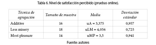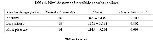 Específicamente, los tests realizados consideraron la evaluación de tres técnicas de agregación seleccionadas a partir del trabajo de Masthoff [10], de acuerdo con su conveniencia y grado de aplicación en entornos publicitarios; la tabla 3 resume las definiciones de las técnicas empleadas. En este sentido, cada una de las estrategias de agregación fue sometida a prueba usando el algoritmo de similitud usuario-usuario seleccionado durante la fase de pruebas offline. De acuerdo con los resultados, en términos generales se puede concluir que las personas percibieron mayor novedad en los anuncios desplegados en la pantalla del Smart TV, como era de esperarse de acuerdo con el planteamiento de la hipótesis. No obstante, un análisis más profundo será presentado en la siguiente sección con el objeto de aclarar detalles del comportamiento de las técnicas de agregación consideradas.