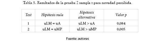 La tabla 4 resume algunos resultados estadísticos con respecto a la novedad percibida por los usuarios para cada una de las técnicas de agregación. El valor de la media sugiere que la técnica de''Mínima miseria'' ofrece un mejor comportamiento con respecto a la novedad percibida. Sin embargo, es importante averiguar si esta diferencia es significativa, dado que la evaluación se llevó a cabo para muestras de usuarios diferentes; en otras palabras, el propósito es determinar si el grado de novedad percibida usando la técnica de ''mínima miseria'' es significativamente mayor con respecto a la técnica aditiva'' o de ''máximo beneficio''. Para soportar este análisis, se hizo uso de la técnica estadística two tample t, de acuerdo con los siguientes lineamientos: se debe considerar una hipótesis nula durante la prueba; en este caso, existen dos hipótesis nulas; la primera de las cuales propone que la novedad percibida a partir del uso de la técnica aditiva es la misma con respecto a la técnica de mínima miseria; en los mismos términos, la segunda hipótesis involucra las técnicas de mínima miseria y máximo beneficio. En ambos casos, se considera una hipótesis alternativa, la cual propone que la estrategia de mínima miseria ofrece un mayor grado de novedad percibida. La tabla 5 muestra los resultados del análisis para ambas hipótesis tomando como base un valor p de 5 %; en este sentido, un valor de p por debajo de 0,05 es una evidencia estadística que aprueba la hipótesis alternativa sobre cualquiera de las hipótesis nulas.