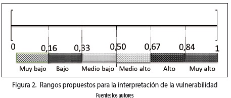 De este modo, cada uno de los componentes del modelo puede tener en la fórmula general de vulnerabilidad valores entre el 0 y el 1, en donde el 0 se asocia a condiciones de baja exposición y baja sensibilidad; y los valores cercanos al 1 se manejan de manera opuesta. Según lo anterior, la vulnerabilidad tiene seis rangos equidistantes de interpretación como se muestra en la figura 2.