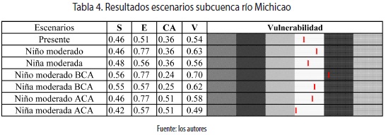 Para la subcuenca del río Michicao en el escenario actual, la vulnerabilidad media alta (0,54) es atribuida a la desarticulación social, la baja presencia institucional y la escasa inversión ambiental (tabla 4). La capacidad adaptativa se afecta por los conflictos jurisdiccionales y una baja cobertura del acueducto en el municipio de Cajibío. Las limitaciones en la planificación ambiental dificultan el desarrollo de programas que conserven las zonas de regulación hídrica de la subcuenca.