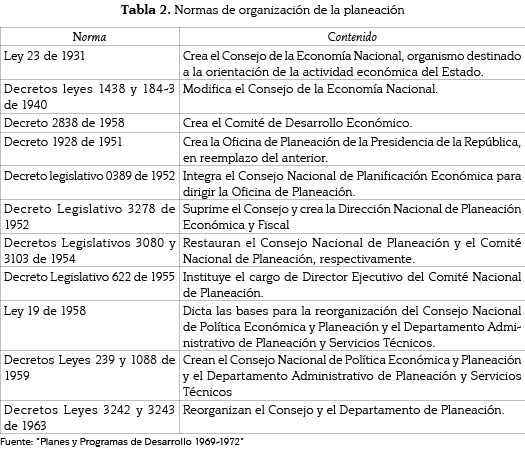 Ya desde 1931 se venía desarrollando en Colombia un marco 'institucionalizado' para la orientación de la actividad económica, que se manifestó en la creación en 1931 de un Consejo Nacional para la planeación de la actividad económica (Ver tablas 1 y 2).
