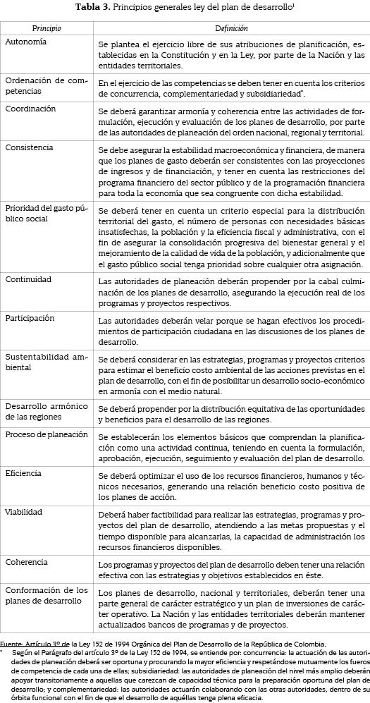 En cumplimiento de lo anterior, de una parte, el Congreso de la República de Colombia expidió la Ley 152 de 1994 Orgánica del Plan Nacional de Desarrollo, y de otra, desde 1995 se vienen aprobando por parte del Congreso las leyes que tratan bien sea el plan de cada administración o, bien, el plan de inversiones públicas, según lo consignado en la tabla 1 supra. Así, la Ley 152 de 1994, su artículo 3° expone un extenso catálogo de principios que deben ser cumplidos en la planeación del desarrollo, en el ámbito nacional y territorial.